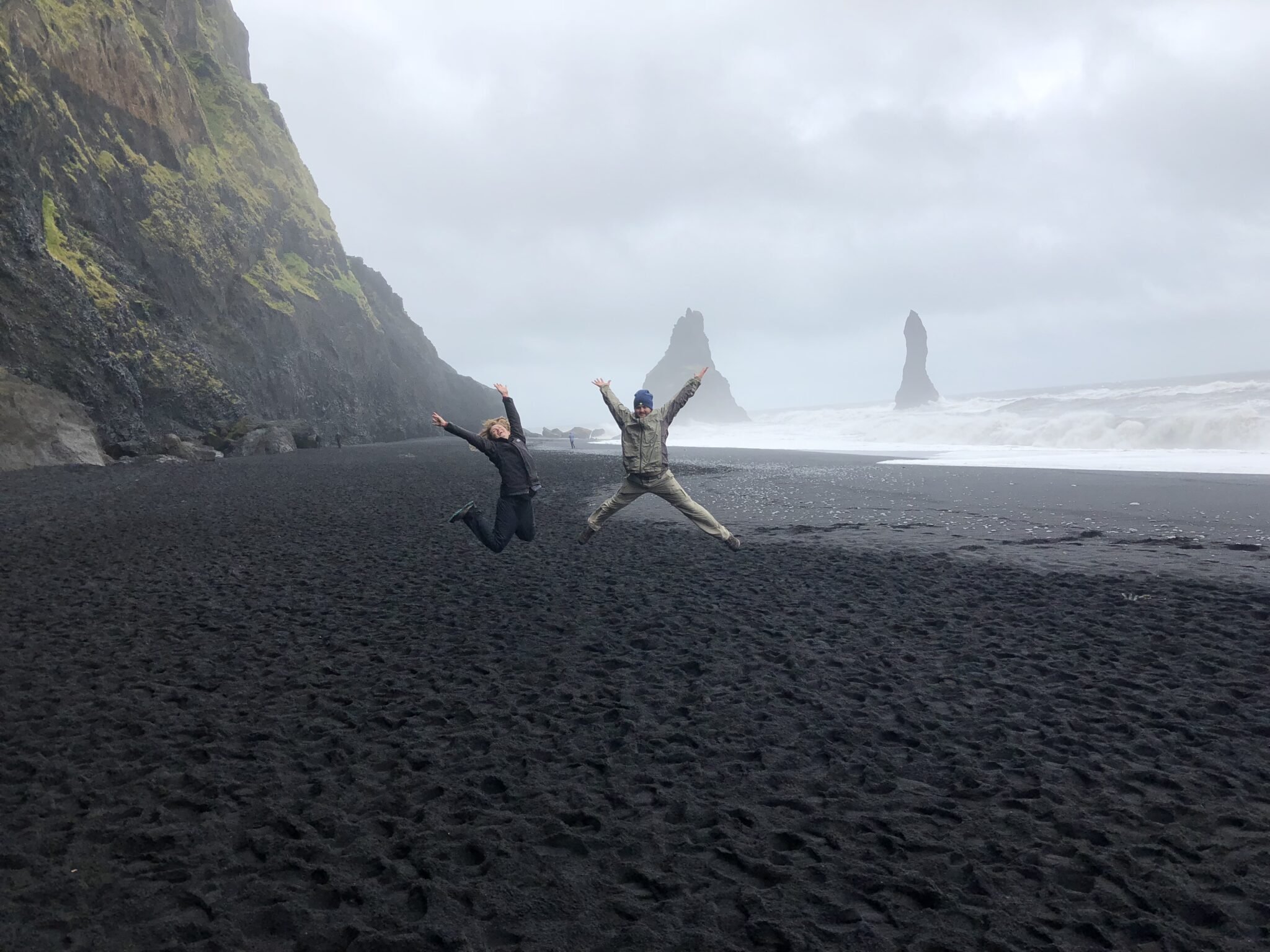 Your next stop will be the famous black sand beach – Reynisfjara! This black sand beach is right outside the town of Vik, where you will stay for the night. The black sand along with the iconic basalt columns, crashing waves and amazing views make this beach unique and memorable. Thankfully it stopped raining a bit for us to be able to enjoy the scenery here!